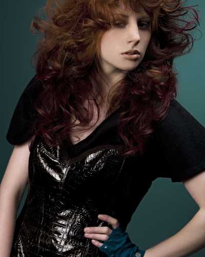 Bij Michelle is gebruik gemaakt van ‘Touch of Vibrancy’ van Color Touch om mooie, diepe, multidimensionale tinten te creëren die het haar een schitterende glans geven. De kleur is van onderaf opgebouwd naar boven. Het lange onderhaar heeft een donkere intensieve violet kopertint gekregen, terwijl in het bovenhaar fellere nuances zijn verwerkt, zoals koperbruine en goudbruine tinten. Ondanks deze heftige kleuren heeft dit kapsel met veel slag en volume geen heftige uitstraling, omdat de donkere basistint nog door de bovenlaag heen schijnt.