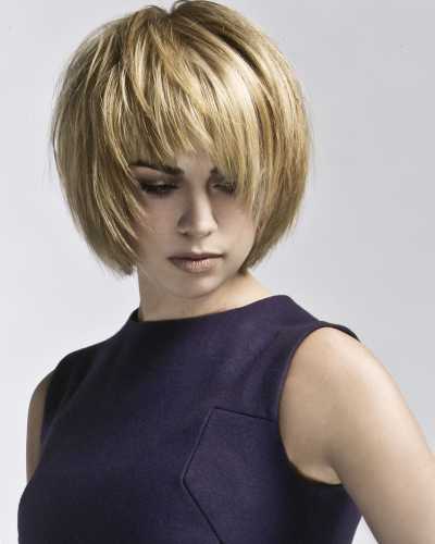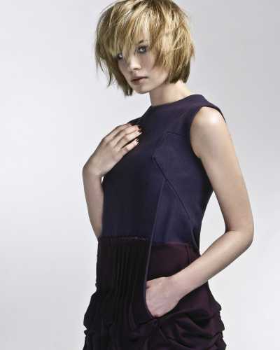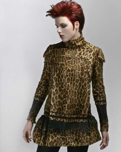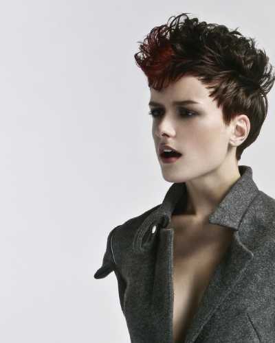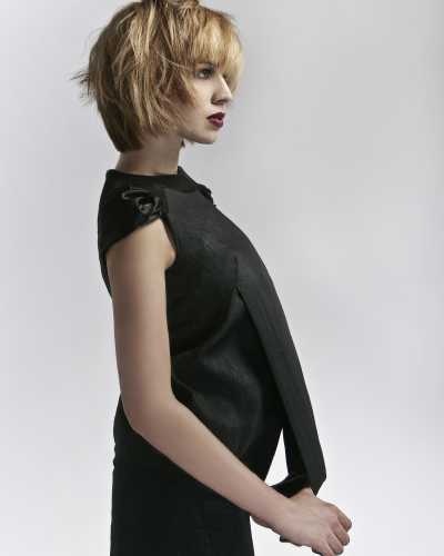 Look 1, foto 1 - Voor deze steile look is Style Foundation aangebracht in nat haar. Deze stylingbasis is speciaal ontwikkeld voor gekleurd haar en geeft een briljante glans. Het product is gemakkelijk uit het haar te kammen, waarna het heel eenvoudig opnieuw te stylen is voor een andere look, zonder het te hoeven wassen. Handig als je na een dag werken nog wilt uitgaan! Het haar is met een halfronde borstel geföhnd, maar losjes met de hand kan ook. Het haar is gedroogd zoals het valt en geknipt is, en gefinisht met Brilliant Affair, voor lichte stevigheid en extra glans.
