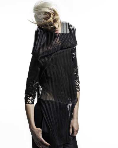 For ‘I-Dentity’ the models wear feminine, black clothes of different textures. Accents are used to underline the uniqueness of each of these women. The clothing is never heavy, but rather glossy and transparent. The make-up is artistic, with copper and grey accents and with either expressive eyes or expressive lips.